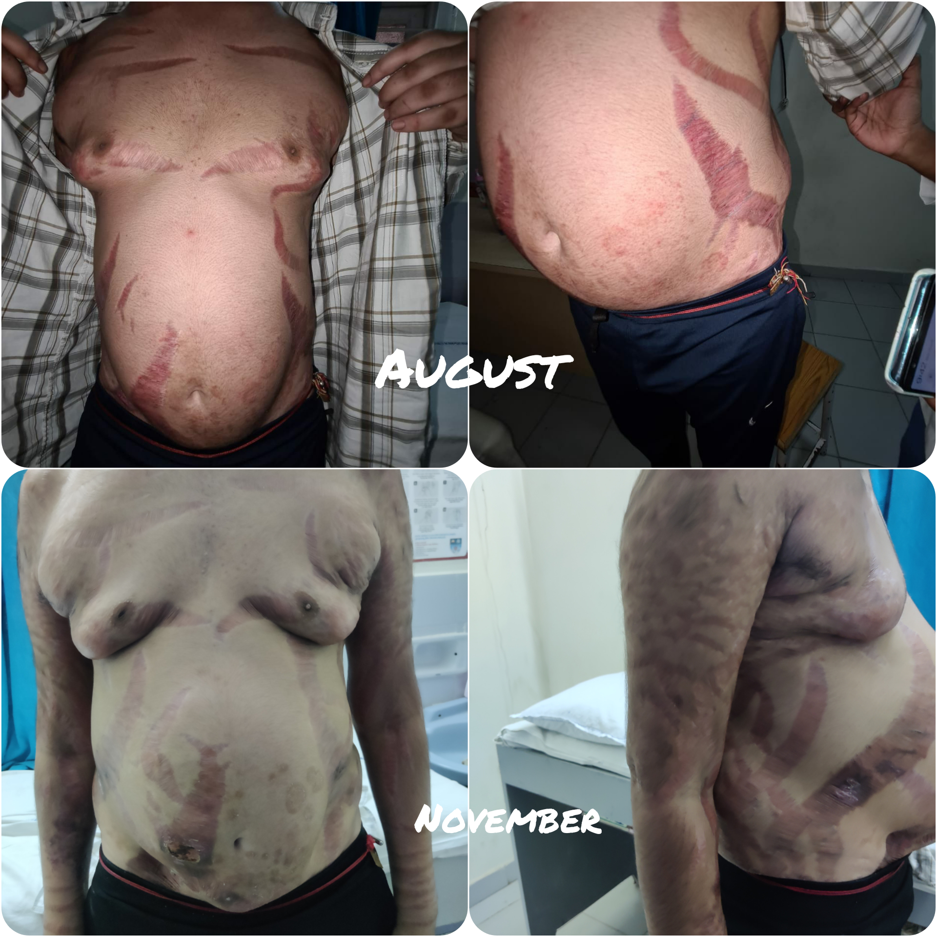 Later after 2 months he developed multiple hyper pigmented plaques over lower limbs ,abdomen , for which he again visited same place and used ayurvedic oils over the leisons.